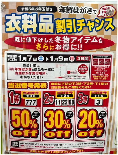 2025年のお正月では、一等は下3桁「777」でしたが、その前の年では、下4桁が「2024」になると、衣料品5店まで半額などありました。