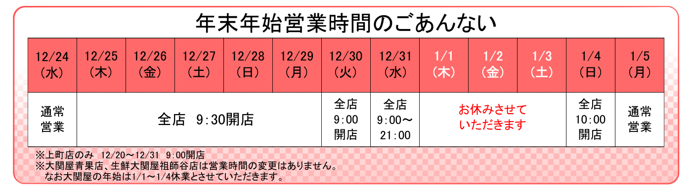 - 上町店のみ:12/20 – 12/31 9:00開店