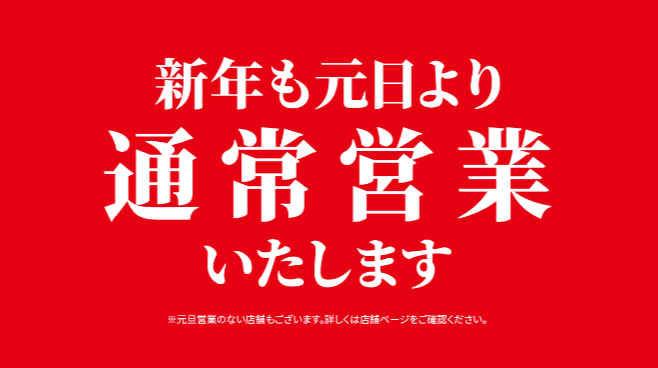 24時間営業の店舗も多いので、初詣帰りに寄るのも良いですね。 - 年始(1月2日): 通常営業