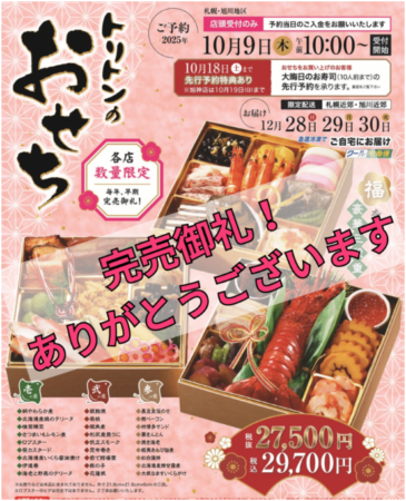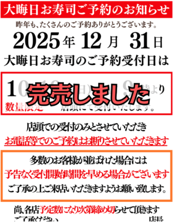 - 北海道の店舗の大晦日の持ち帰り予約は、既に完売。